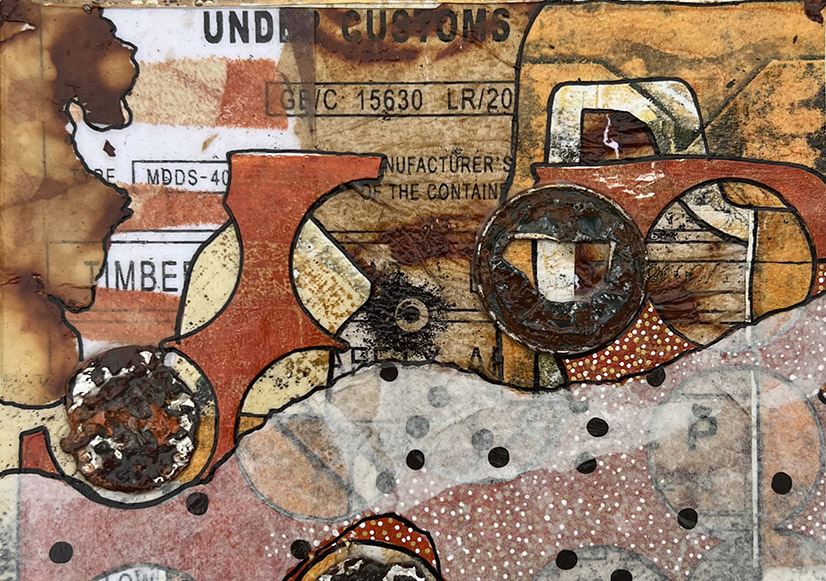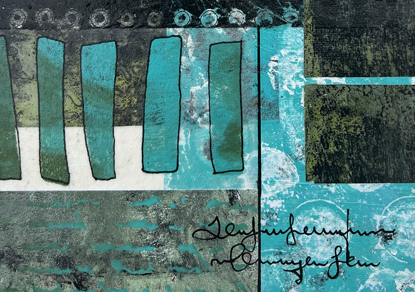 Mixed media betekent dat je alles mag gebruiken wat je inspireert. Mijn basis is altijd acrylverf en papier. Maar verder verwerk ik er van alles in, zoals flessendoppen, stof, touw, metaaldraad. The sky is the limit. Op dit moment werk ik veel met de gelplate. Dit is een flexibele plaat van siliconen waarop ik verf aanbreng. Hiermee maak ik monoprints die ik combineer tot schilderijen en collages. Geen vaste regels, geen grenzen.